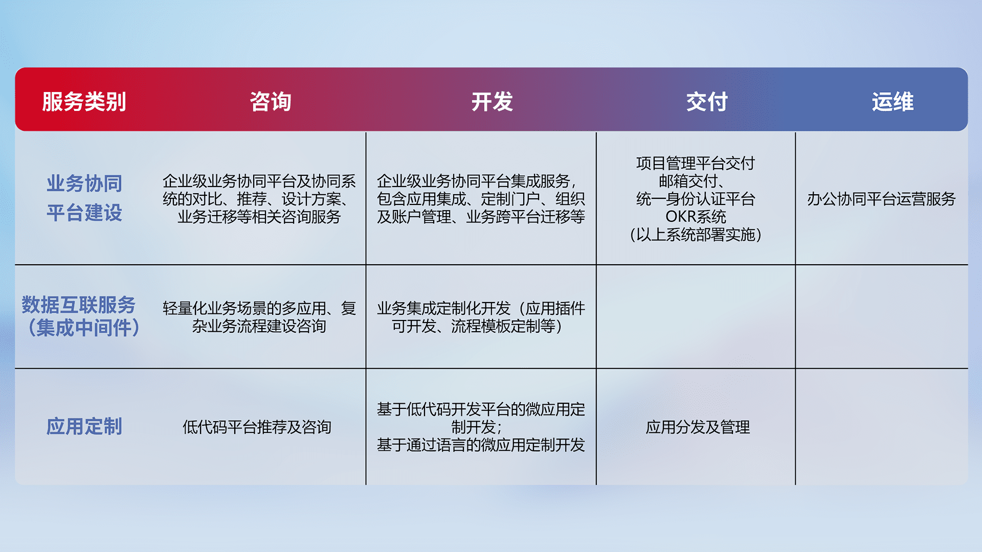 针对钉钉、、企微、、、、IDaas等平台级产品提供产品的规划、、、、方案、、交付、、、、定制化开发等服务,,,实现如统一协同办公、、、智能客户服务、、混合会议管理、、智能数据查询、、、等业务场景,,实现数字化转型。。