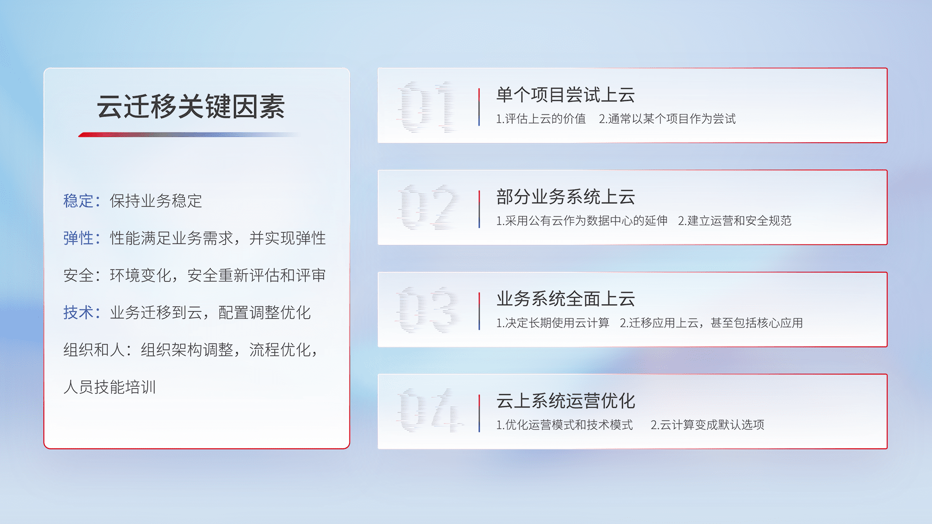 结合实际业务,,,从规划设计、、云平台选型、、、、云原生改造、、、、数据迁移、、集成交付,,,迁移全过程为客户识别最佳上云路径,,,做好风险识别管理,,设计网络架构、、、身份权限、、、安全审计合规、、、操作审计、、、、日志审计、、监控告警策略、、、、多站点容灾设计等,,,,对云上基础设施进行整体规划,,,,提升IT治理水平,,,,以满足弹性、、、、高可用、、高性能的需求。。