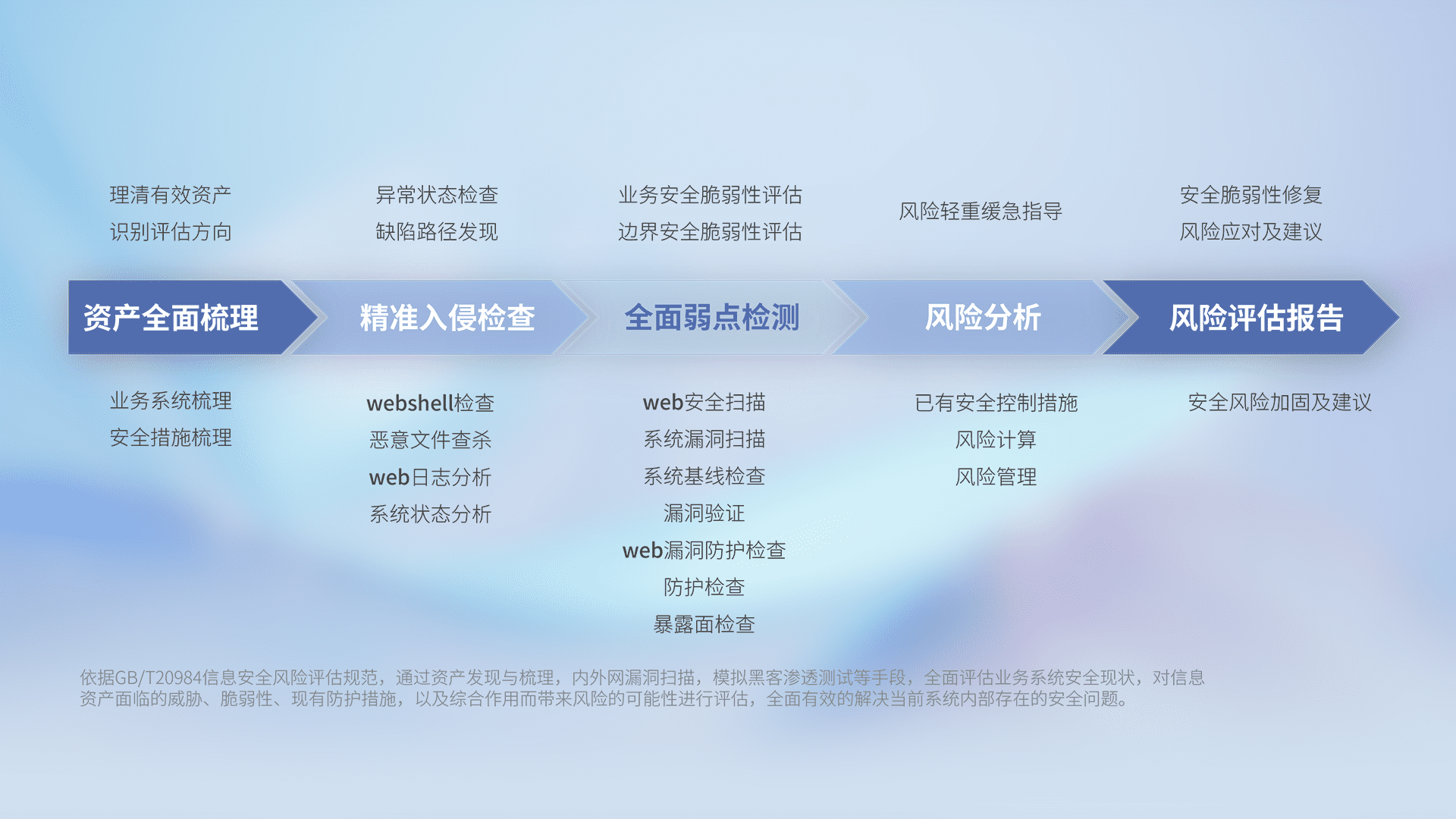 针对客户行业特性,,,,以专业的安全服务+多厂商联合解决方案提供专属的一站式安全管理服务,,帮助客户全面感知网络空间威胁,,,,基于识别、、、、检测、、、分析、、、防护、、、、监测、、、响应的服务理论模型,,,从方案咨询、、、集成交付、、评估验证、、、优化加固、、、、运维运营,,致力于为客户提供完整的闭环管理式安全服务。。。以实战经验为客户打造高抵御风险的安全体系,,,帮助客户发现威胁、、、、对抗威胁、、、处置威胁,,,,不断积累安全对抗能力,,,持续保障数字化安全。。。。